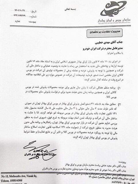 هشدار بورسی‌ها به ایران‌خودرو درمورد ادامه عرضه محصولات در بورس درحالی که مدیرعامل گروه صنعتی ایران‌خودرو در نامه‌ای خطاب به مدیرعامل بورس کالای ایران، خواستار لغو عرضه آتی این شرکت برای ۵۰۰۰ دستگاه خودرو دناپلاس شده است، سرپرست مدیریت نظارت بر ناشران سازمان بورس خواهان عرضه منظم خودروها تا پایان سال شد.